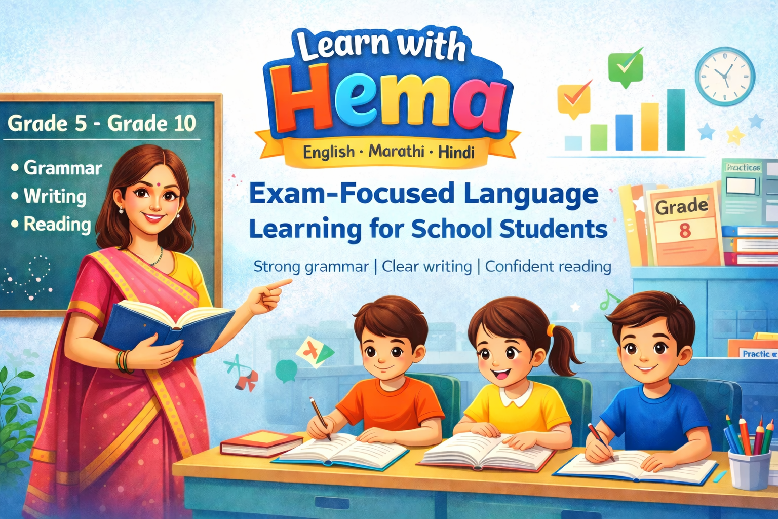I'm Hema Dhoot, a passionate educator with over 30 years of experience in teaching English, Hindi, and Marathi. With an M.A. in English and B.Ed in Economics & History, I've had the privilege of guiding students across various age groups, helping them build a strong foundation in languages.